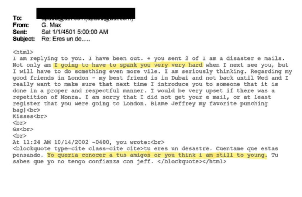 “Te estoy respondiendo. He estado fuera. Además, me enviaste 2 correos de ‘soy un desastre’. No solo voy a tener que azotarte muy muy fuerte cuando te vea, sino que tendré que hacer algo aún más malo. Estoy pensando seriamente. Con respecto a mis buenos amigos en Londres: mi mejor amigo está en Dubái y no regresa hasta el miércoles, y realmente quiero asegurarme de que la próxima vez que te presente a alguien, se haga de manera correcta y respetuosa. Me molestaría mucho si se repitiera lo de Monza. Siento no haber recibido tu correo, o al menos no registrar que ibas a Londres. Culpa a Jeffrey, mi saco de golpes favorito. Besos. Gx”